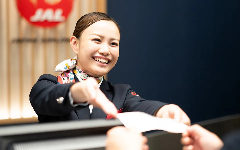 これから飛行機をご利用になるお客さまが最初に訪れる場所がカウンターです。「こんにちは、いらっしゃいませ」。いつも元気な声と素敵な笑顔でお客さまをお迎えします。